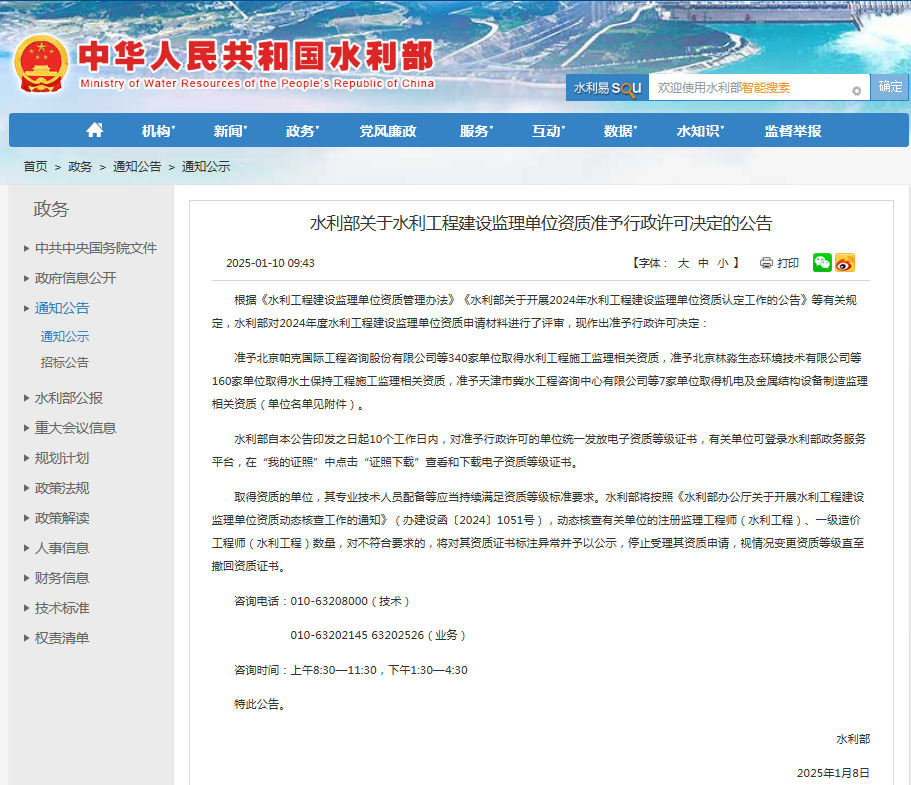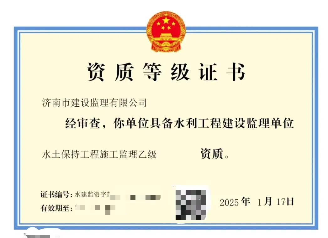 二〇二五年一月,經(jīng)水利部批準(zhǔn),我公司同時(shí)取得水利工程施工監(jiān)理乙級(jí)資質(zhì)及水土保持工程施工監(jiān)理乙級(jí)資質(zhì)。這是我公司在取得工程監(jiān)理綜合資質(zhì)后,又獲得的住建部管理范疇之外的從業(yè)資格,為公司經(jīng)營業(yè)務(wù)開辟新的領(lǐng)域,為公司業(yè)務(wù)類型的拓展提供新的平臺(tái),也為公司持續(xù)、快速發(fā)展奠定了堅(jiān)實(shí)基礎(chǔ)。