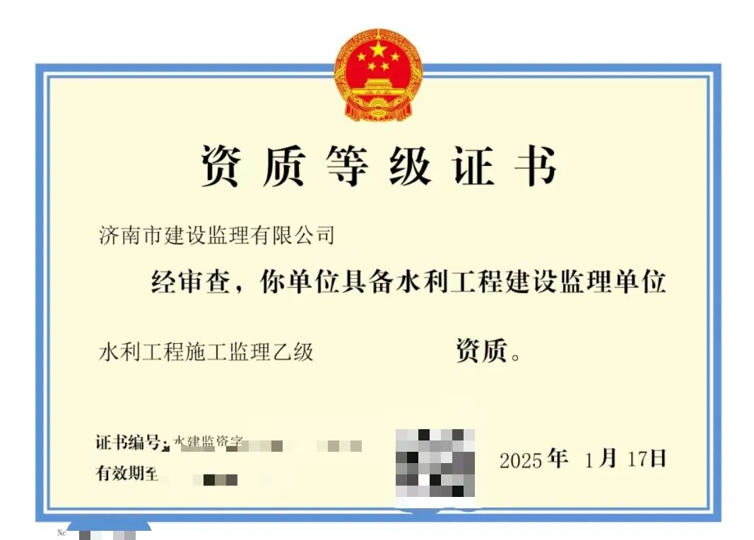 熱烈祝賀濟(jì)南監(jiān)理取得兩項(xiàng)水利工程建設(shè)監(jiān)理資質(zhì)